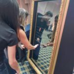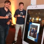 O Espelhomatic é um espelho de 50 polegadas que faz fotos dos participantes na posição retrato (vertical). Além de animações de telas divertidas, o participante pode escrever virtualmente na foto ou aplicar stickers digitais.