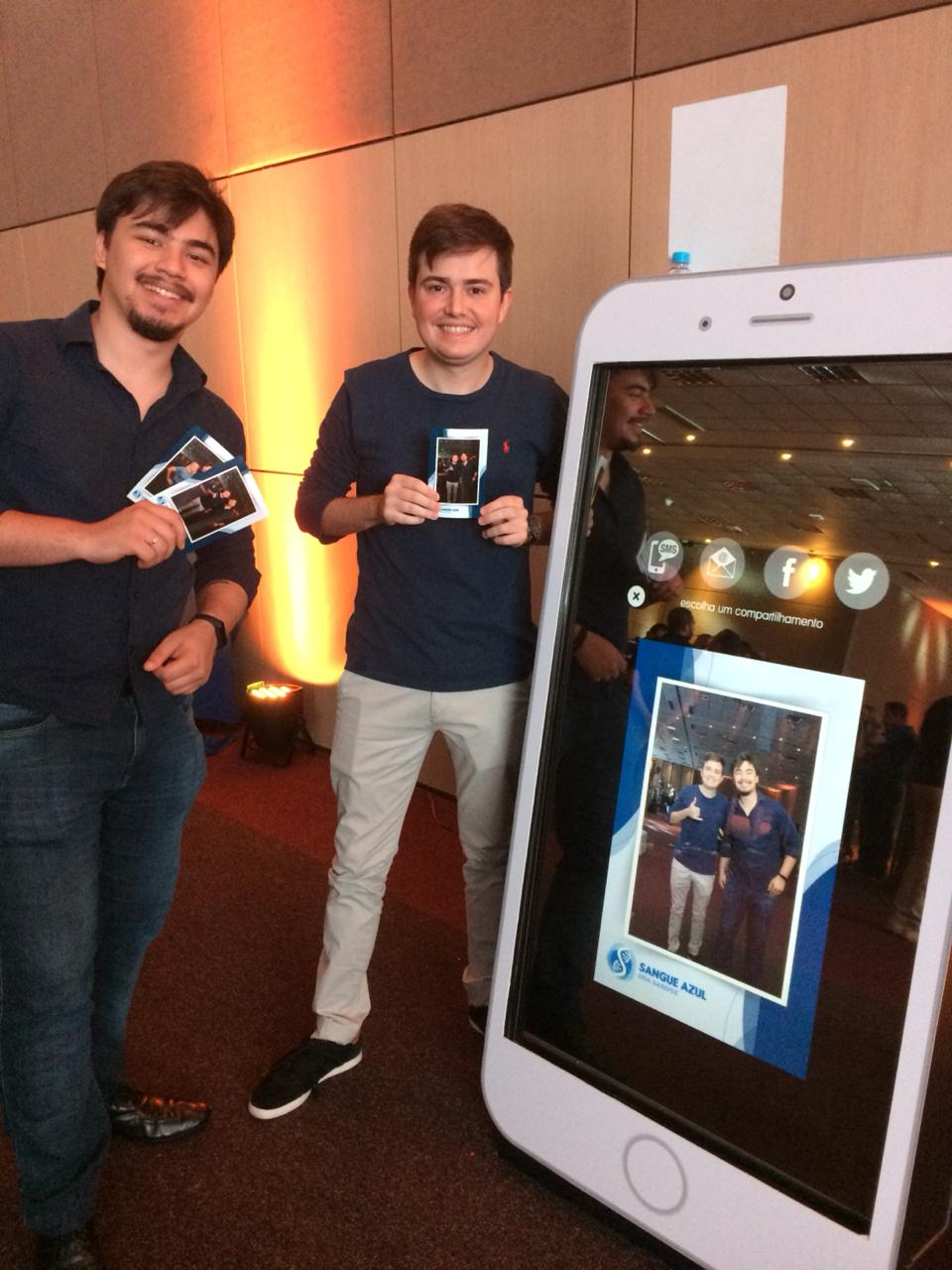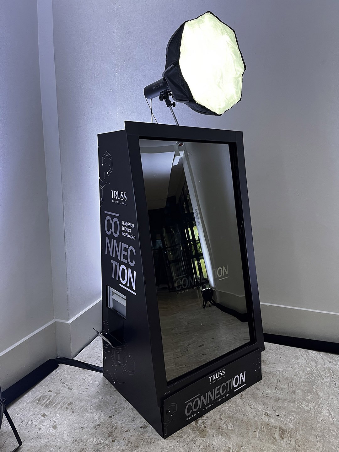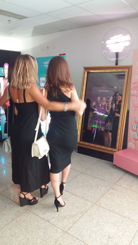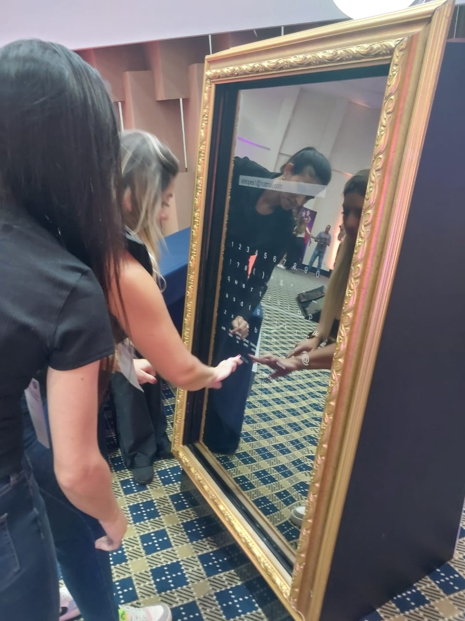 O Espelhomatic é um espelho de 50 polegadas que faz fotos dos participantes na posição retrato (vertical). Além de animações de telas divertidas, o participante pode escrever virtualmente na foto ou aplicar stickers digitais.