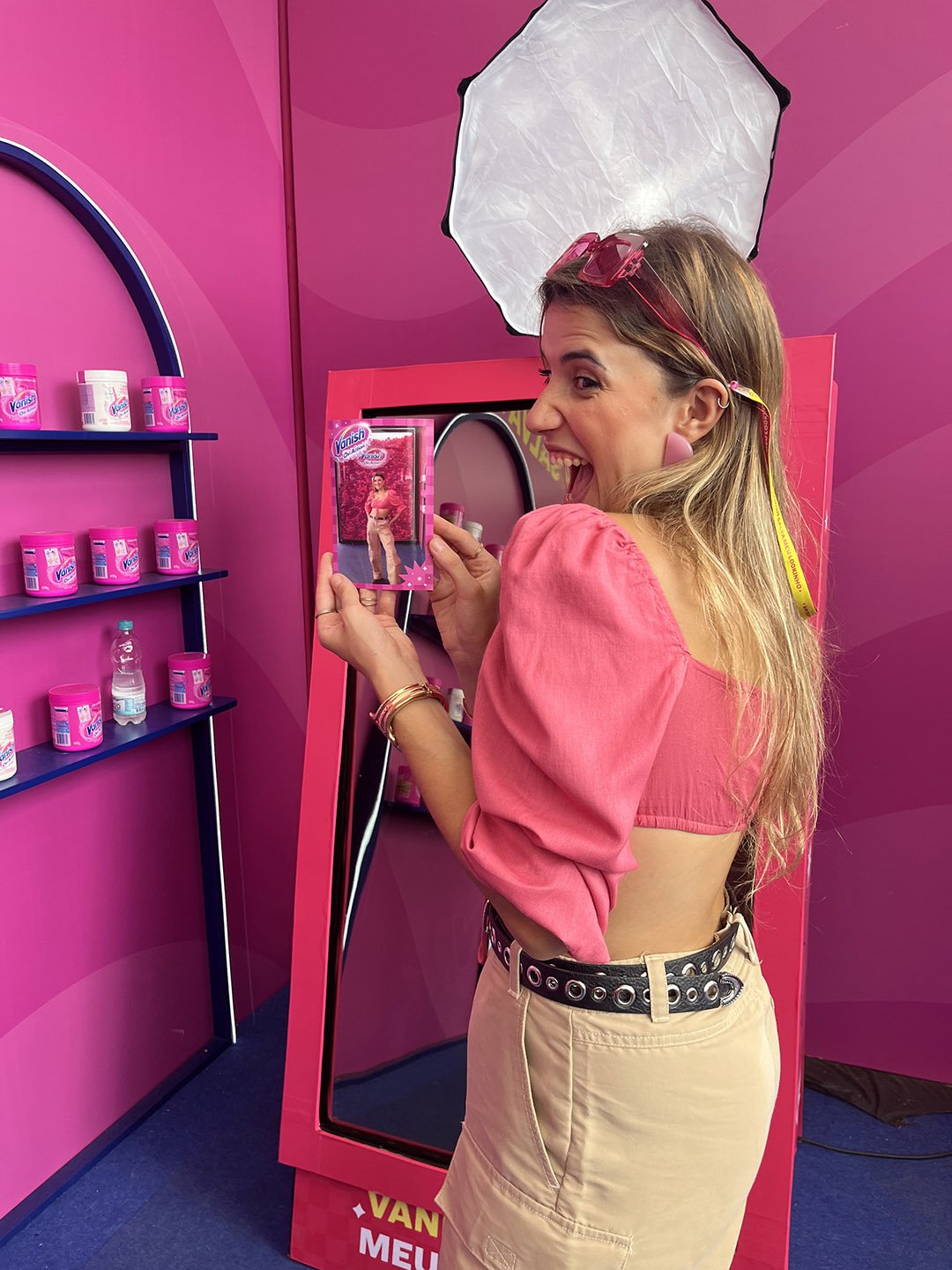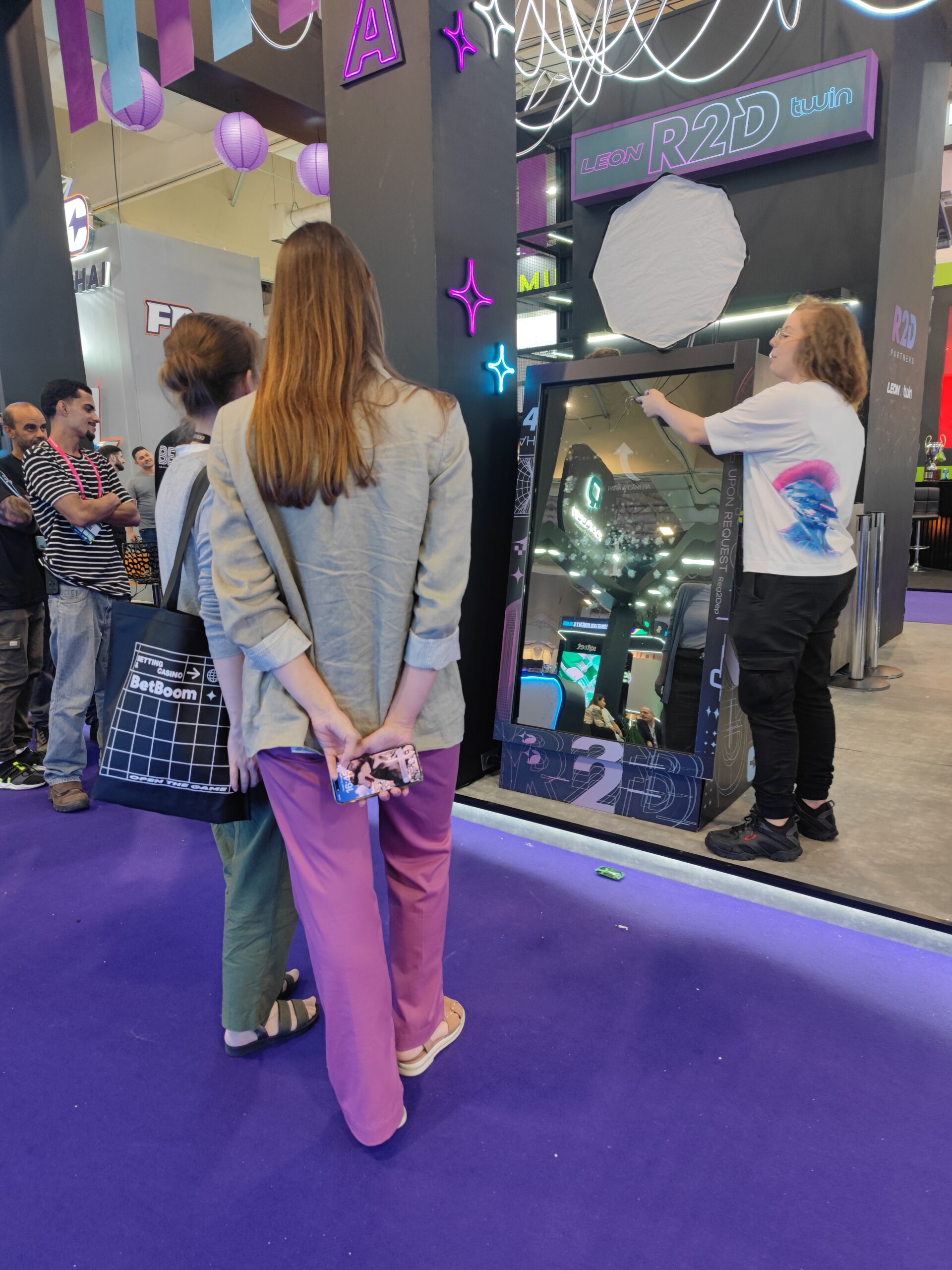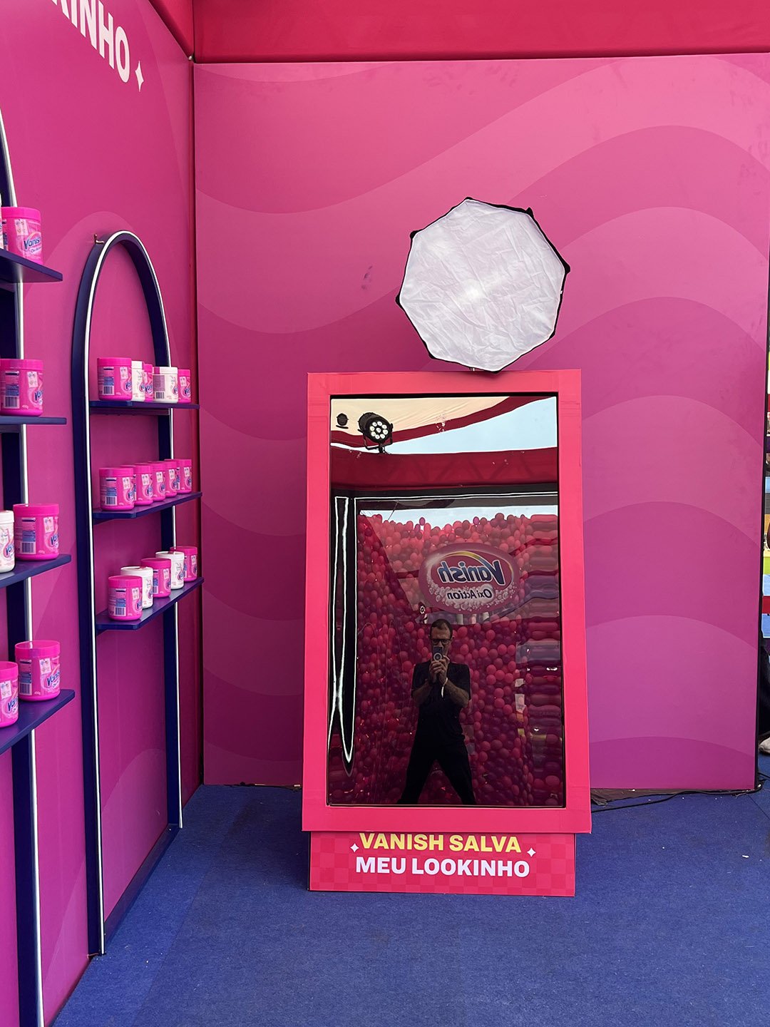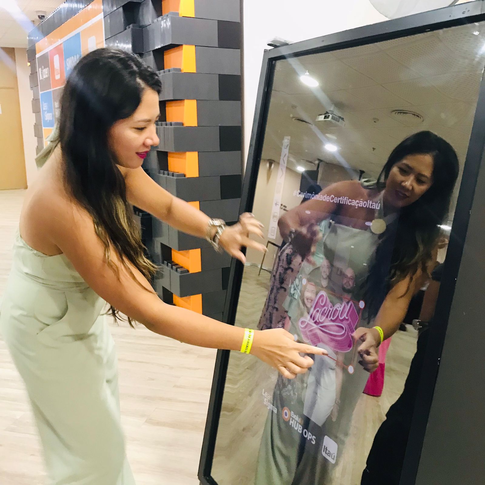 O Espelhomatic é um espelho de 50 polegadas que faz fotos dos participantes na posição retrato (vertical). Além de animações de telas divertidas, o participante pode escrever virtualmente na foto ou aplicar stickers digitais.