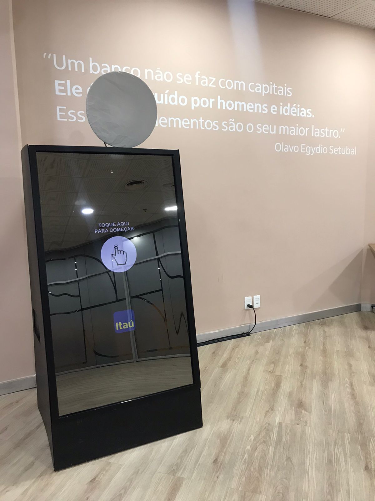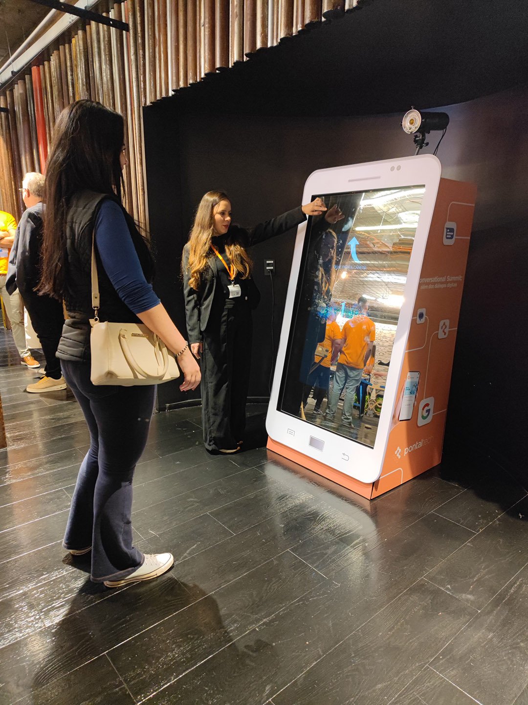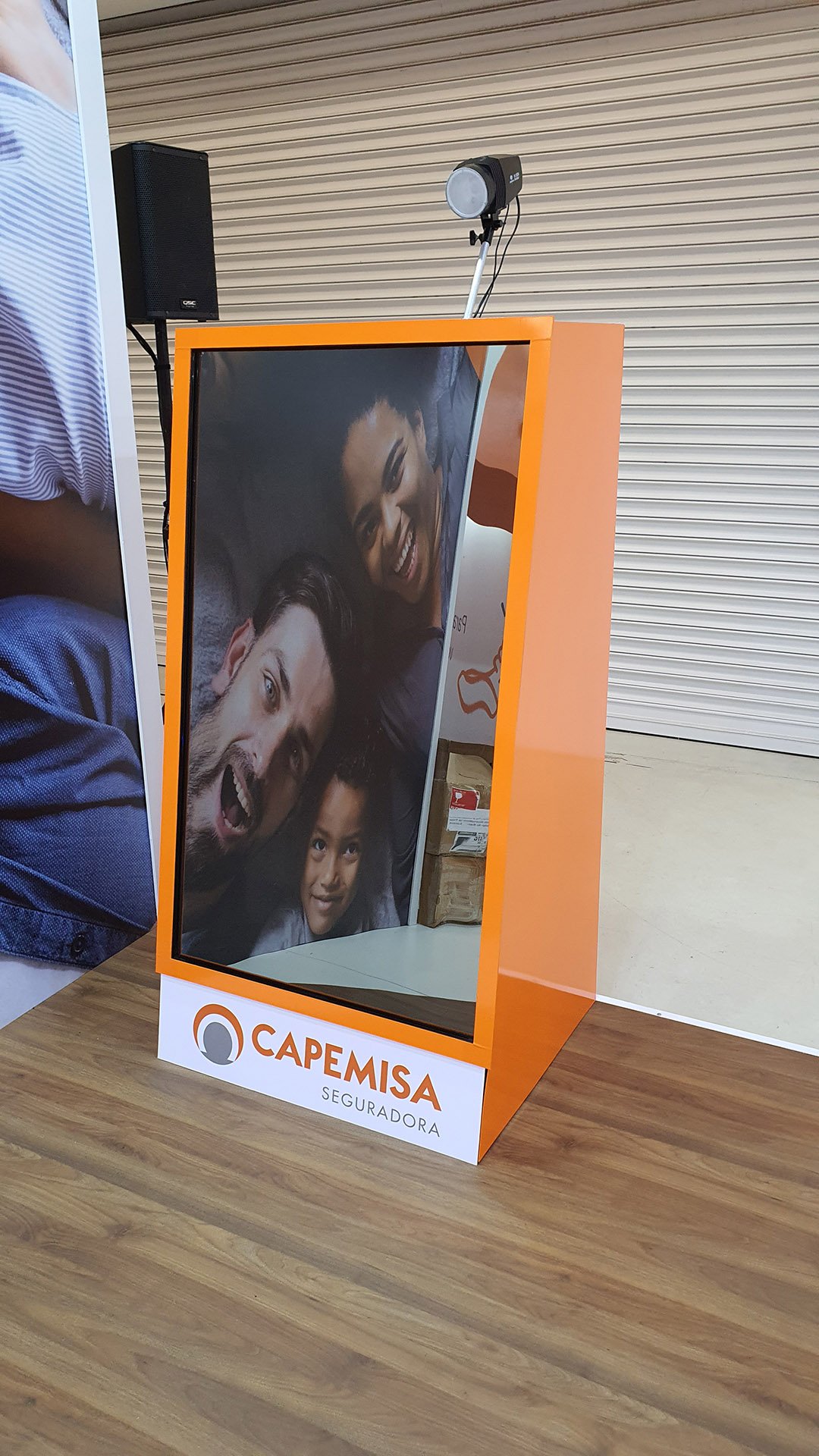 O Totem Espelho Mágico Espelhomatic funciona como um espelho interativo que faz fotos de corpo inteiro (na vertical) e possibilita a pessoa assinar ou desenhar na foto, personalizando a imagem diretamente na tela e ainda imprimir a foto na hora.