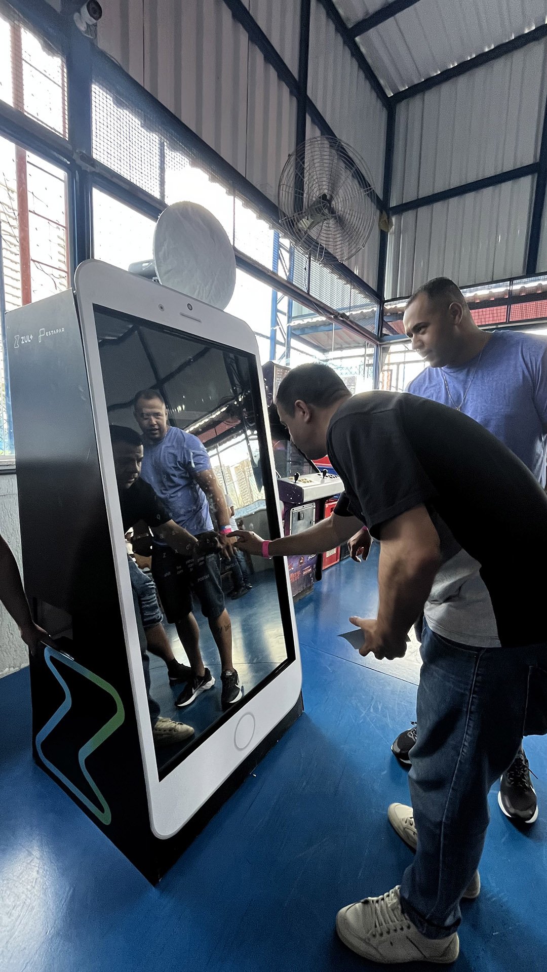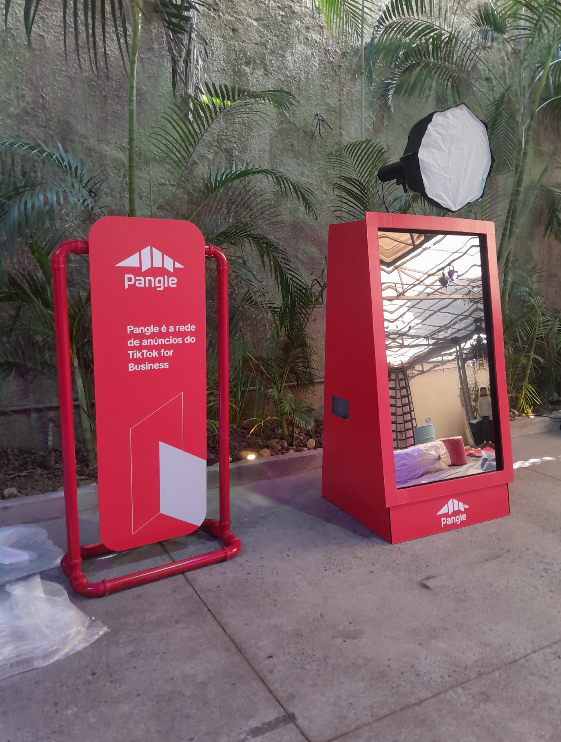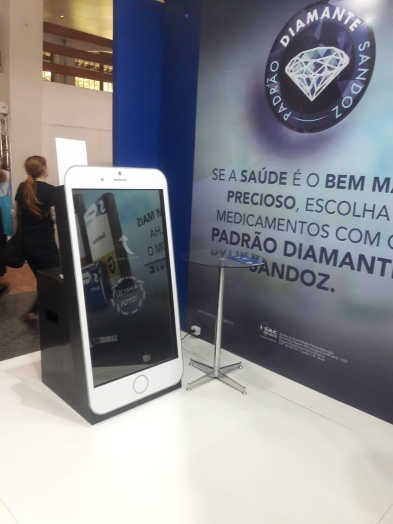 O Totem Espelho Mágico Espelhomatic funciona como um espelho interativo que faz fotos de corpo inteiro (na vertical) e possibilita a pessoa assinar ou desenhar na foto, personalizando a imagem diretamente na tela e ainda imprimir a foto na hora.